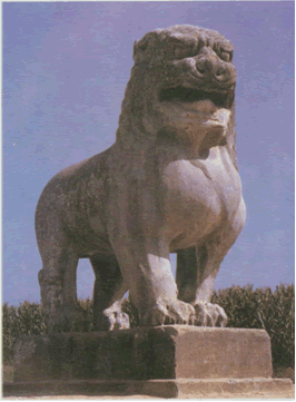南北朝時(shí)期,墓前雕像有所恢復(fù),一般都在墓前設(shè)置一對(duì)或多對(duì)石獸。這種悖常為“神獸”的想象中動(dòng)物形象,被成為“麒麟”,有的似獅虎,卻右翼,被稱為“避邪”。這種石雕一般都比較龐大,姿態(tài)宏偉,整體感較強(qiáng),又較為濃厚的漢代遺風(fēng)?,F(xiàn)存遺跡多為南北朝時(shí)作品,江蘇南京周邊比較多見。其中最為杰出的是江蘇句容石獅村梁南康簡王蕭績墓前的石雕群,造型簡潔,體積感強(qiáng),最能代表當(dāng)時(shí)的藝術(shù)風(fēng)格。