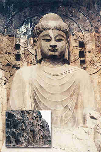 河南洛陽城南的龍門石窟,力經(jīng)東魏、北齊、隋、唐多個(gè)朝代之開鑿,作品龐雜,遺留作品也較多。可惜的是,解放前被外國列強(qiáng)盜去了許多造像以及頭、手臂等局部,造成了無法挽回的損失。賓陽中洞是龍門石窟中比較重要的一處,是北朝時(shí)期有史實(shí)可查的,其形制結(jié)構(gòu)與云岡曇曜五窟相似,窟內(nèi)飾有蓮花、飛天、云氣等圖案,氣氛神秘、紋飾華麗,但無瑣碎之感;蓮花洞內(nèi)的石雕蓮花特別突出,窟內(nèi)主佛像為站立姿勢,手臂的雕刻尤為動(dòng)人,,似有柔軟彈性之感;古陽洞是龍門石窟中較大的一個(gè),歷史年代也較早,最有代表性的是在洞內(nèi)壁面上雕滿了小佛龕,幾乎每龕都有造像題記,中國著名的書法碑帖“龍門二十品”中,古陽洞中的就有十九品。
