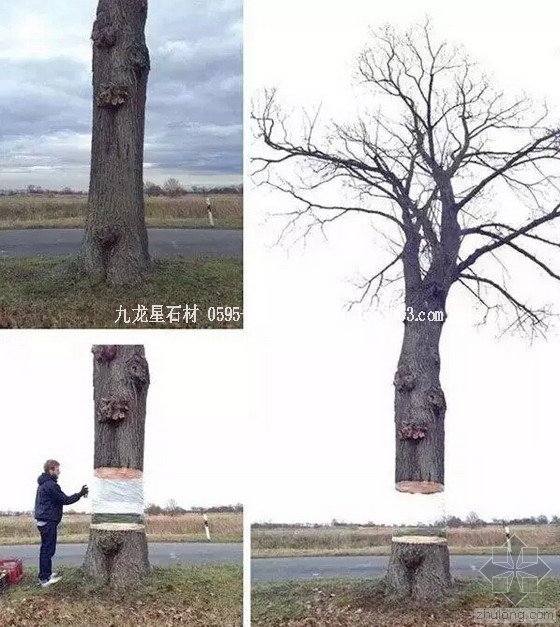 第七、無形的樹,美術(shù)設(shè)計創(chuàng)造了橫穿樹干中部的德國鄉(xiāng)村景觀,給人一種樹被砍斷的幻覺。只是簡單的在樹上包裹塑料布、噴繪背景景觀,再加上兩分的樹干就獲得了這種效果。