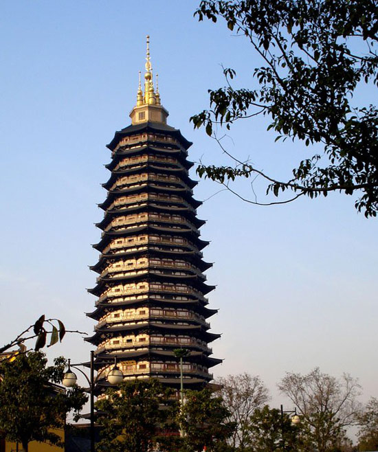 天寧寶塔乃中華第一佛塔(全球最高佛塔)位于江蘇省常州市天寧寺內。天寧寶塔始建于2002年4月,于2007年4月30日開光??偨娣e2.7萬平方米,塔高13層153.79米,為國內4000多座寶塔之最;從底層地宮到頂層鐘樓,整座寶塔以佛教文化為主線,以東陽木雕、揚州漆器、常州亂針繡、惠安石雕等手工藝術為表現(xiàn)手法,巧妙地詮釋了大乘佛教的諸多教義。佛塔的建成,與北方云崗大佛、中原龍門大佛、西方樂山大佛、東方靈山大佛、南方香港天壇大佛遙相呼應,成為五方五佛的佛心。