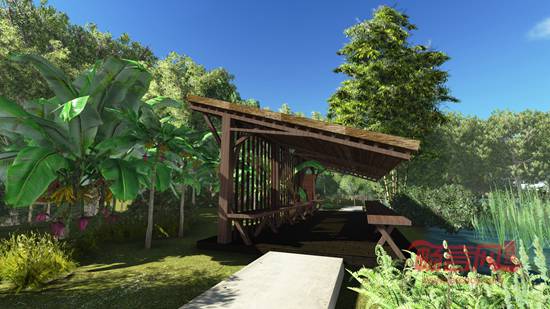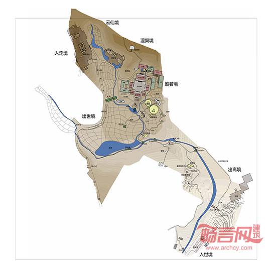 入世境為寺域前區(qū),作停車、暫時(shí)休整之用;山門為情境轉(zhuǎn)換媒介,拾階而上,山林夾道,洗滌心靈,是為出離境;寺院前部為平坦區(qū)域,以水田農(nóng)禪景觀為主,視野開(kāi)闊,設(shè)置放生池,種蓮養(yǎng)魚,利用參天古樹(shù)和竹林營(yíng)造自然茶室,茶亭茶室與植物互為取景,交相輝映,分布錯(cuò)落有致,形成趣味的園林廊道系統(tǒng),一派世外桃源景象,是為出世境;寺廟殿宇區(qū)域?yàn)榘莘饍x式及僧人居住生活場(chǎng)所,以唐風(fēng)建筑及庭院為主,是為般若境;經(jīng)過(guò)禪堂,石階引向后山的祖師塔區(qū)域,在祖師塔上加茅草穹頂,暗示祖師結(jié)茅而居,是為涅槃境;寺廟后方沿山而建的禪修中心和善客堂,為禪修者提供的專修場(chǎng)所,用高大喬木和竹林與寺廟區(qū)分隔,獲得寂靜氛圍,是為入定境;后山密林深處,罕有人至,閉關(guān)獨(dú)居,悠然逍遙,是為云仙境。