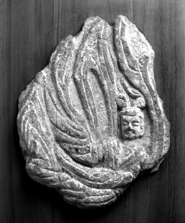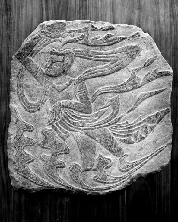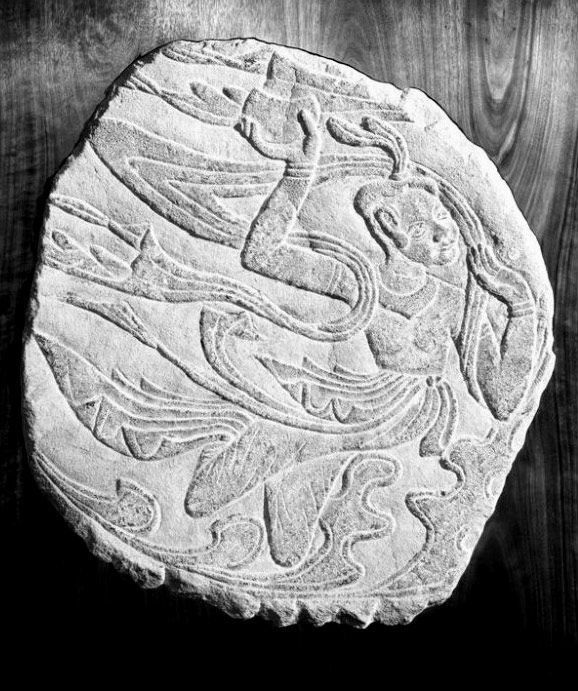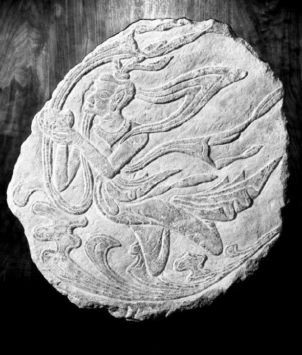 山西天龍山第3窟東魏浮雕手持蓮花花蕾和缽的飛天,尺寸:90.5x79.2cm。