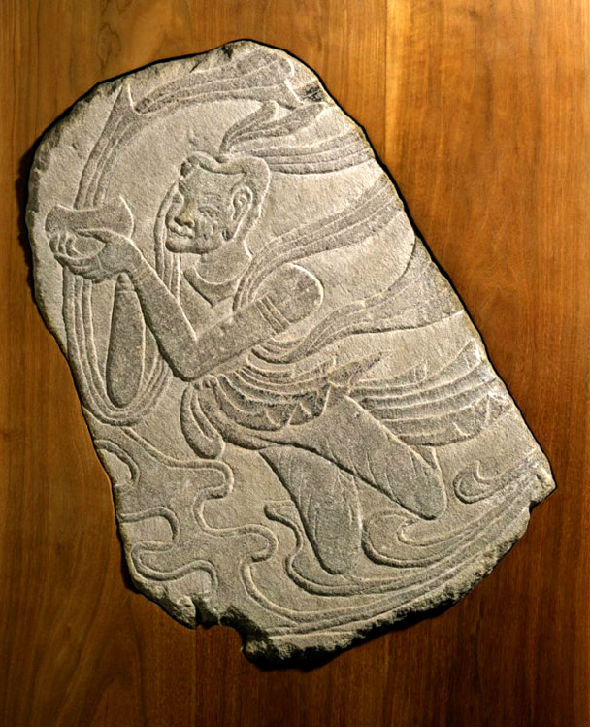 美國哈佛大學賽克勒博物館收藏天龍山石窟東魏擊鼓飛天,彩繪砂巖浮雕,尺寸:40x34cm。