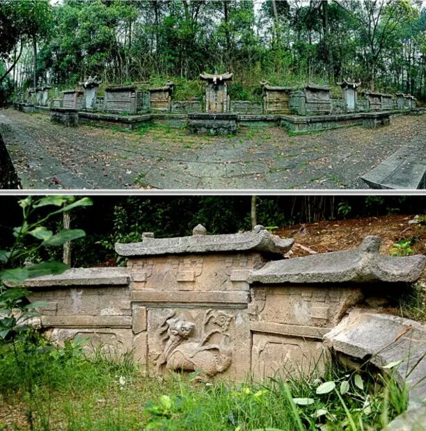 上圖:喬亭馮氏螃蟹形山墓群全景;下圖:祖墓馮伯達(dá)墓環(huán)墉上的麒麟浮雕該墓葬位于赤岸鎮(zhèn)喬亭村下西山螃蟹形山,墓向坐西北朝東南,共有墓葬11座。以祖墓馮伯達(dá)墓為核心,左昭右穆排列,符合傳統(tǒng)的禮制。墓前有供子孫祭奠的甬道、祭臺(tái)和三級(jí)拜臺(tái),還有月池。每座墓前設(shè)石供桌一張,石供桌束腰和圭腳等部位淺浮雕盤長、方勝與如意云頭等紋飾。墓前立石碑,刻墓主身份、行號(hào)等,廡殿頂碑額,以一斗三升斗栱挑檐。左右兩側(cè)石欄板圍護(hù),有單鉤欄,也有重臺(tái)鉤欄,欄板上浮雕朱雀、麒麟、仙鹿、天馬等祥瑞圖案。墓包土封,設(shè)環(huán)墉。馮伯達(dá)墓屋環(huán)墉上高浮雕麒麟回首圖案,刀法蒼勁古樸,工藝精湛。