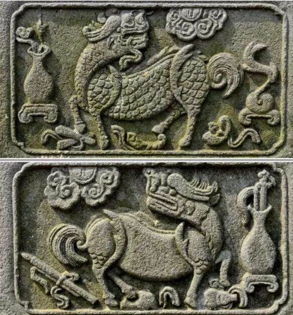 本譜圖案位于黃山八面廳大門門枕石上,左雄右雌,雄者全身披麟稱麒,雌者全身披毛稱麟。麒麟為傳說中的神獸,麒麟現(xiàn)世,代表天下太平。圖中麒麟為獅形嘴,鏟形鼻,鼓突眼,馬蹄足。其前腿奮蹄,身子矯健,鬃毛上揚(yáng),尾毛蜷曲,回首眷顧。旁飾祥云、如意、尺板、筆、錠、犀角、葫蘆、佛塵等吉祥八寶圖案。