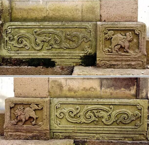 本譜石雕位于德星堂門廳立面的地栿和門枕石部位,粉紅色礫巖的門枕石,如意云頭方框,里面剔地浮雕麒麟圖案。上圖大門左側(cè)為雄麒,全身披麟。青石地栿,平雕陽刻卷草螭龍紋。下圖在大門右側(cè)的門枕石雕雌麟,全身披毛,青石地栿,平雕陽刻卷草鳳紋。龍鳳呈祥,代表富貴吉祥。麒麟送子,天降祥瑞。