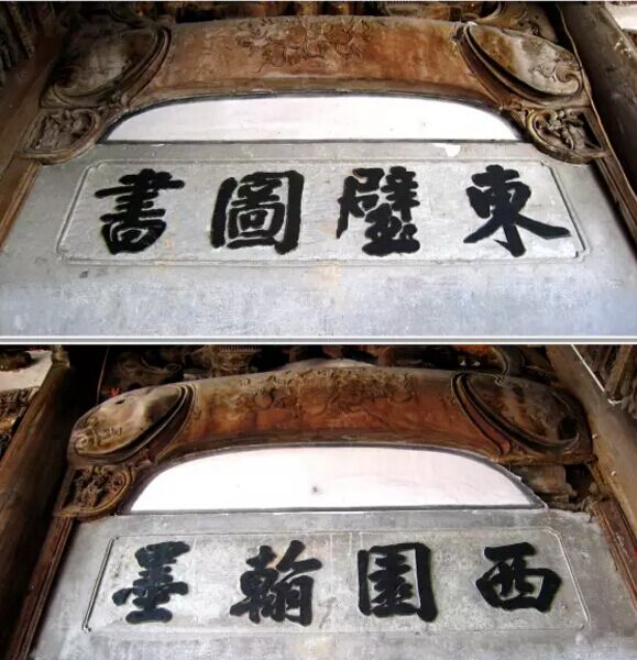繼志堂正廳山墻前廊兩端的龍虎門,門額嵌青石匾,矩形框,剔地起突,陽刻楷書黑漆:“東璧圖書”“西園翰墨”四字匾,字體遒勁有力。門額采用互文手法,比喻這個(gè)地方到處有古籍和文壇雅集,是很有文化氛圍的地方。此聯(lián)出典自唐代張說的《恩賜麗正殿書院賜宴應(yīng)制得林字》:“東璧圖書府,西園翰墨林?!睋?jù)史書載,漢代丞相蕭何在未央宮建天祿、石渠二閣,以藏歷代典籍和檔案文獻(xiàn)。魏晉時(shí)期建“西園”以宴建安七子,宋代馬遠(yuǎn)繪《西園雅集圖》傳世,米芾、張士奇作記。