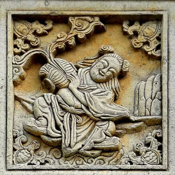 本譜石雕位于佛堂新屋里,取材于民間喜聞樂見的神話傳說。其原形相傳是唐代的萬回,象征家人和睦。宋代始作和合之神,主婚姻和合。圖中合仙捧圓盒,盒中吐納如意祥云紋。和仙手持荷花。兩位活潑可愛、頭梳元寶發(fā)髻、長發(fā)披肩的孩童,笑容滿面,十分惹人喜愛。人們借此來祝賀新婚夫婦白頭偕老,永結(jié)同心,家人相親相愛,家庭和睦。四個(gè)岔角上蝙蝠銜一枚銅錢,寓意福祿雙全。