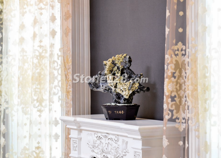 在新中式風(fēng)格的大廳中,石雕作品的外形與背景窗花的菱形相互協(xié)調(diào),取得了很好的諧調(diào)效果。石雕的色彩與整體環(huán)境的深色調(diào)相互統(tǒng)一,臘梅花典雅的黃色又活躍了色彩的意境氛圍。整體空間的直線(xiàn)風(fēng)格與石雕作品的曲線(xiàn)造型相對(duì)比,剛?cè)嵯酀?jì),收放有度,取得了很好的視覺(jué)效果。