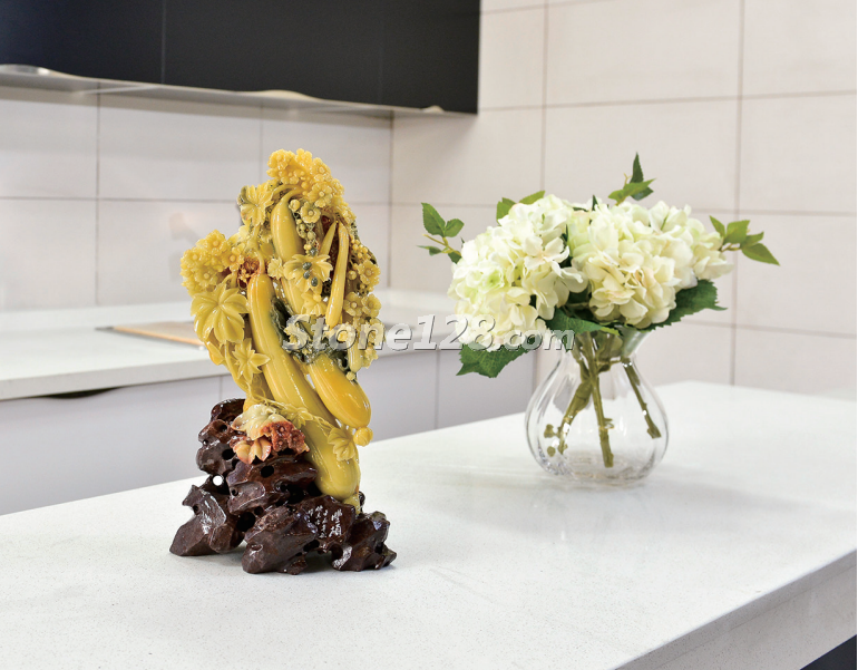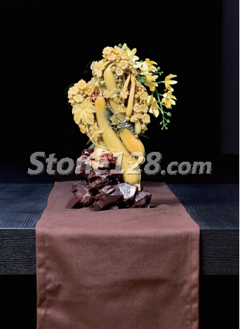 擺放在餐廳,既有美滿(mǎn)和諧的氛圍,又有艱苦奮斗的寓意。作品的曲線(xiàn)造型與餐廳環(huán)境的直線(xiàn)造型相互彌補(bǔ),中和了各自的不足。深色的餐桌及背景很好地襯托了淺色的石雕作品,給整個(gè)空間注入了生命力。