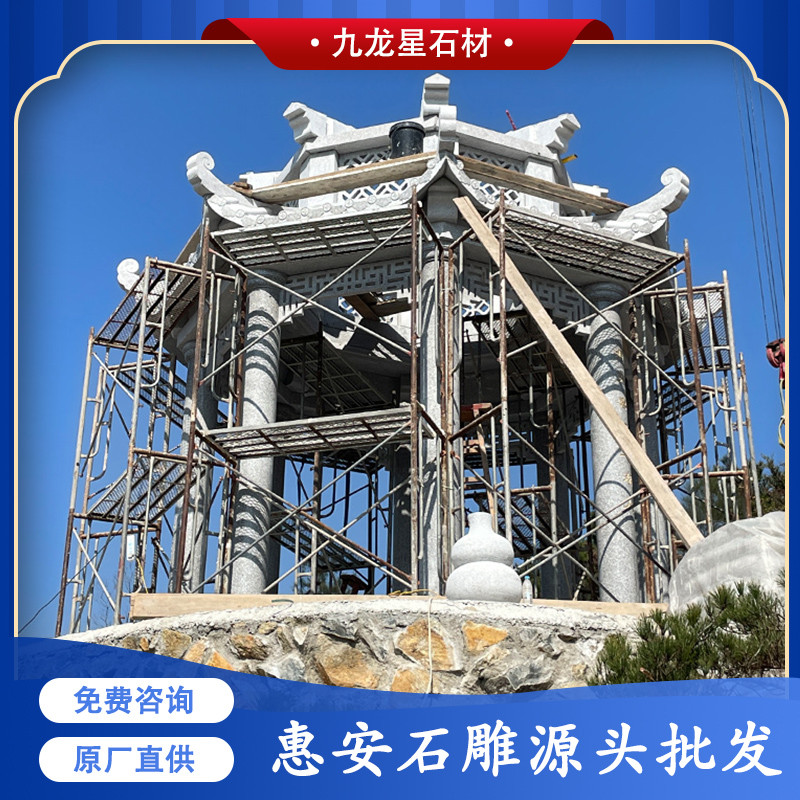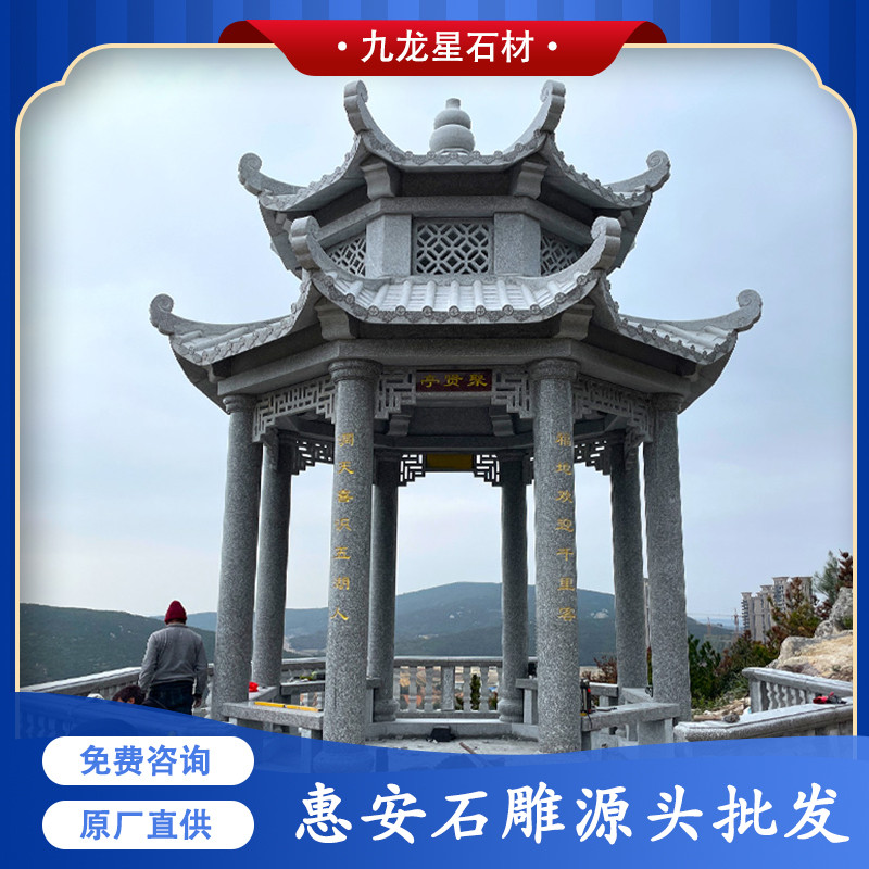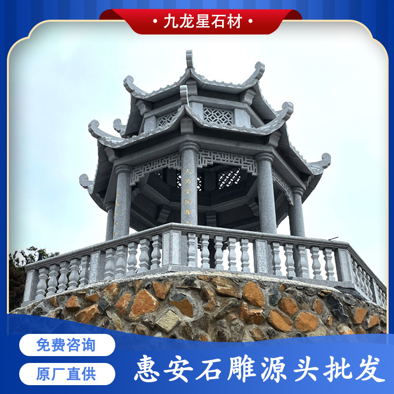 石雕涼亭的作用不僅可以作為休息點、休息區(qū),其實也是景點或者山間的一個標志性建筑,美觀又不容易損壞,抗壓性強。今天主要帶給大家的是我們近期的案例——雙層惠安灰八角涼亭。