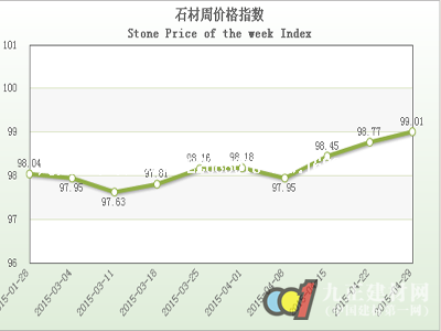 從4月石材周價格指數(shù)走勢圖看,本月石材周價格指數(shù)除2015-04-08期略下調(diào)外,總體基本呈現(xiàn)一路平緩?fù)粕淖邉?價格循序漸進(jìn)調(diào)整。