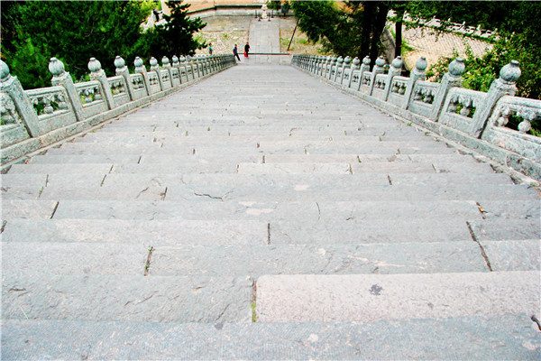 沿著108級(jí)臺(tái)階一步步往上登,臺(tái)階盡頭那座漢白玉牌坊可謂美輪美奐,讓人嘆為觀止。石牌樓四柱三門(mén),上蓋三個(gè)樓頭,分上下兩層,居中的樓頭既高且大,兩個(gè)耳樓頭下傍,四根方柱插入四方礅,每根方柱又有前后兩根圓柱斜頂,結(jié)構(gòu)緊湊而穩(wěn)固。石牌樓形制剛健挺拔,通體精雕細(xì)刻,堪稱石雕建筑藝術(shù)珍寶。中門(mén)的拱券上雕有二龍戲珠,兩條龍飛騰在團(tuán)團(tuán)白云之中,張著大嘴,睜著圓目,很有氣勢(shì)。龍頭、龍角、龍牙、龍舌、龍須、龍鱗、龍爪和云頭等,雕得恰到好年,富有質(zhì)感,雕工紛繁而脈絡(luò)清晰。中門(mén)橫伏間的嵌板上題有“佛光普照”。