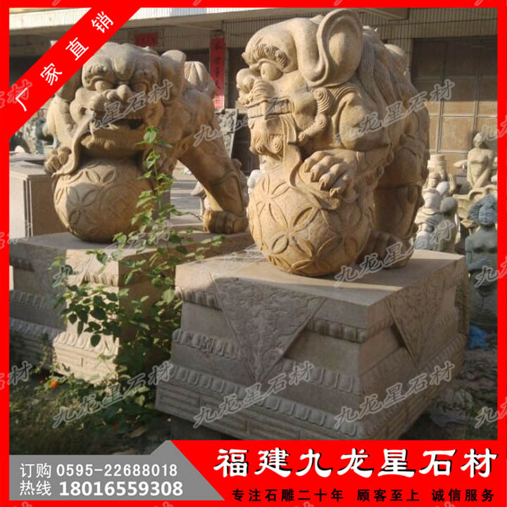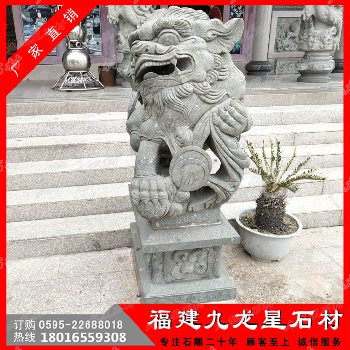 石雕動物獅子的腦門寬闊隆起,天庭飽滿,下頜裂開,地閣方圓.眼窩深,眼球鼓,鼻根深陷,張嘴似欲吞欲笑,多呈憨態(tài).毛發(fā)呈卷曲紐狀,自然地附著頸項(xiàng)部,更顯得威而不怒,猛而不殘.石獅有雌雄兩種:雄獅口含圓珠,耳呈葉狀,兩邊超過卷毛高度,毛發(fā)卷曲很有規(guī)律,布滿了耳、頸部。有時腳蹬繡球,表示其性貪玩耍.而雌獅身上多背小石獅子,或足下踩小石獅,表示一種"母愛",很有情趣,一般情況下,門左置雄獅,門右置雌獅。