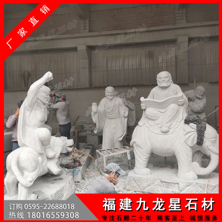 看著每一尊寺院十八羅漢石像,不得不感嘆古人的智慧啊。這些被珍藏的十八羅漢塑像,保存的如此完好,這還是要?dú)w功于,十八羅漢塑像是采用的天然石材手工雕刻而成,純天然的石頭在大自然中被人們開(kāi)鑿來(lái)制作成十八羅漢石像作品,這樣的一整套十八羅漢作品,不僅帶著天地精華,也將人們的智慧和工藝賦予其中,石刻十八羅漢就是最好的安排了吧。古代十八羅漢帶有歷史沉淀的韻味,具有很高的研究?jī)r(jià)值。而現(xiàn)代十八羅漢雕刻為了能有這樣的一份感情,開(kāi)始了對(duì)石雕18羅漢仿古做舊的技術(shù),也更符合一些古建筑,古剎寺院去擺放仿古代石雕十八羅漢擺件。