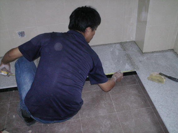 4、鋪貼時(shí),水泥砂漿應(yīng)飽滿地抹在陶瓷地面磚背面,鋪貼后用橡皮棰敲實(shí)。同時(shí),用水平尺檢查校正,擦凈表面水泥砂漿。