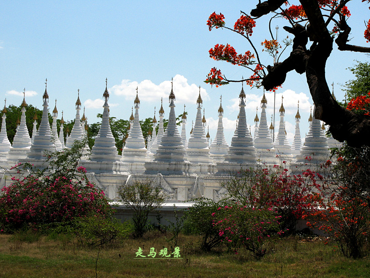 阿都瑪希寺廟里,由729塊大理石雕刻成的經(jīng)書,組成了整齊圣潔的佛塔,在陽光和鳳凰樹紅色花球的環(huán)繞中,看著這些潔白的石經(jīng),心里會(huì)有平靜浮起。