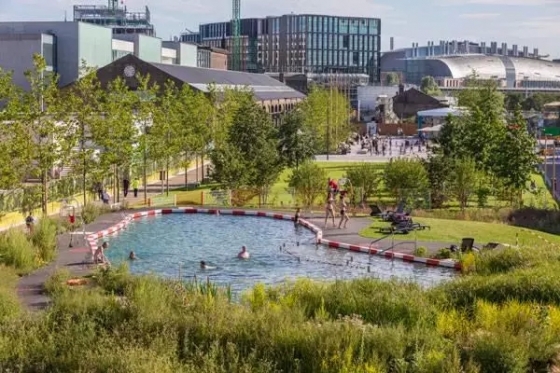 有時(shí),設(shè)計(jì)意圖比作品顯現(xiàn)出的形式更為重要,這個(gè)公園便是如此。該裝置項(xiàng)目意在引導(dǎo)人們思考自然與變化的城市環(huán)境間的關(guān)系。在設(shè)計(jì)師們看來(lái),當(dāng)公園被圍繞在相對(duì)永久的建筑物中時(shí),這些待開(kāi)發(fā)的空間卻在持續(xù)的變化中。因此,他們?cè)趪?guó)王十字街修建了一座泳池,吸引著人們?nèi)秤巍?/p>