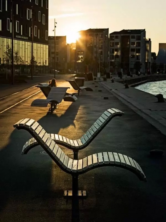 Aalborg Waterfront II是該景觀項(xiàng)目的二期工程,此次設(shè)計(jì)依舊用景觀大道將周邊景致整合起來(lái)。在平坦的前灘后是一些凸起的小山丘,設(shè)計(jì)師從這些自然景色中獲取靈感,將基底抬高,上面建有連貫成片的臺(tái)階,既可以用于抵御洪水,又是可休憩的坐凳。項(xiàng)目中采用原生簡(jiǎn)單的材料,在一系列的開(kāi)闊廣場(chǎng)上種植了茂密的樹(shù)林。