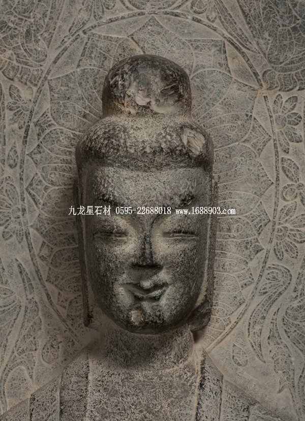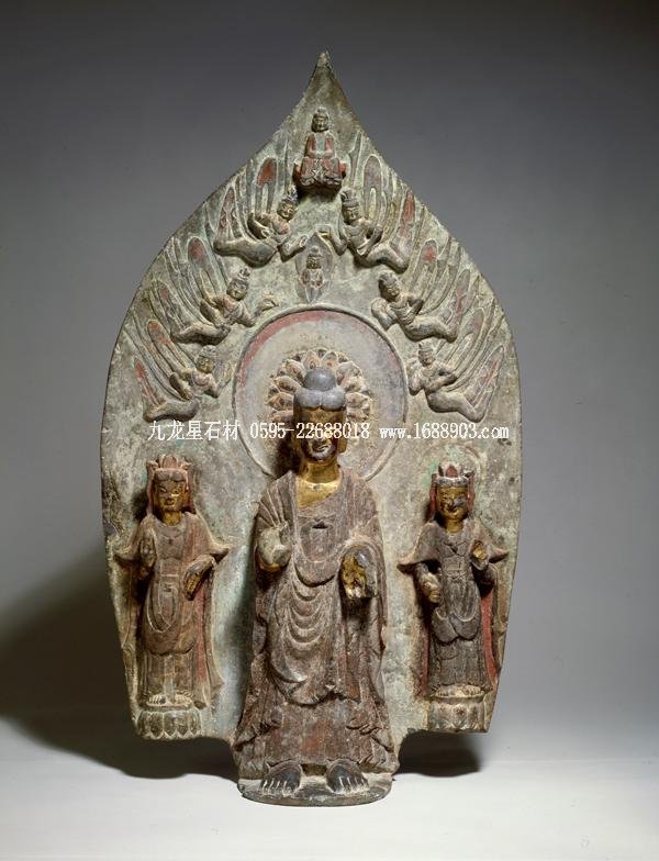 石碑正面雕一佛二菩薩,菩薩腳邊有護(hù)法獅子,現(xiàn)只剩殘體。佛和菩薩面相清瘦,身軀修長,頭部和手腳近似圓雕,佛裝則以高淺浮雕展示不同層次。如佛身上的漢化褒衣博帶式袈裟和衣裙腳部重疊衣褶的造型。他們身后是火焰形大背光,上面用減地陽刻和陰刻手法由中心向外畫出五個裝飾圈。中心圈是佛的頭光,內(nèi)有蓮花瓣;旁圈里是過去七佛;再外圈有六身飛天環(huán)繞,上部有一人形神獸頂一香爐,飛天或持蓮苞、香熏和樂器,姿態(tài)飄逸清揚(yáng);在此圈的尖頭部分又畫出第四圈,內(nèi)含一佛像,禪定趺坐于蓮花寶座上,側(cè)脅兩個飛天;最外圈是飛動的火焰圖案。