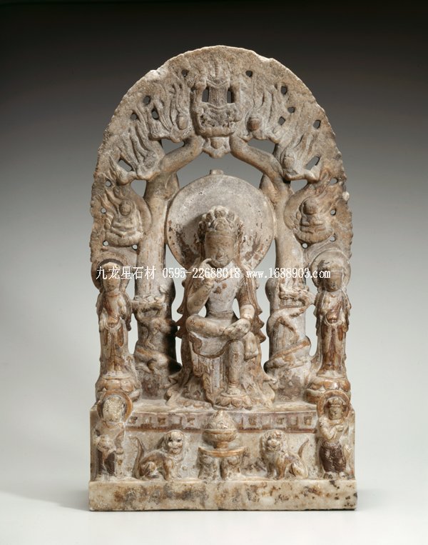 館藏思維彌勒像雖運(yùn)用成規(guī)的造像碑格式和構(gòu)圖,但設(shè)計制作別具一格。用鏤空技法雕出一庭園背景,為白色的大理石作品更增添了一種清新和輕盈的視覺效果。彌勒左腳踩蓮座,半跏趺坐于兩棵大樹之間。樹干有龍盤繞,兩樹枝葉相纏構(gòu)成圓拱形背屏,又有四飛天簇?fù)硪环剿谥醒?。這些細(xì)節(jié)是彌勒經(jīng)典形象的描繪,彌勒在龍華樹下成佛,方塔即釋迦牟尼的舍利塔。蓮座和方塔象征彌勒是釋迦佛的繼承人。彌勒臉形方圓,戴頭冠和瓔珞,軀干和四肢分明,肩臂圓潤,薄裙貼體。兩旁有脅侍菩薩,腹部前凸,一腿側(cè)立,膝蓋略彎,作稍息站勢,開啟了后代菩薩形體造型的新風(fēng)尚。人物造型是漢化和受印度笈多佛雕(Gupta)風(fēng)格影響的產(chǎn)物。此尊造像是北齊時期題材和雕刻巧妙結(jié)合的典范。