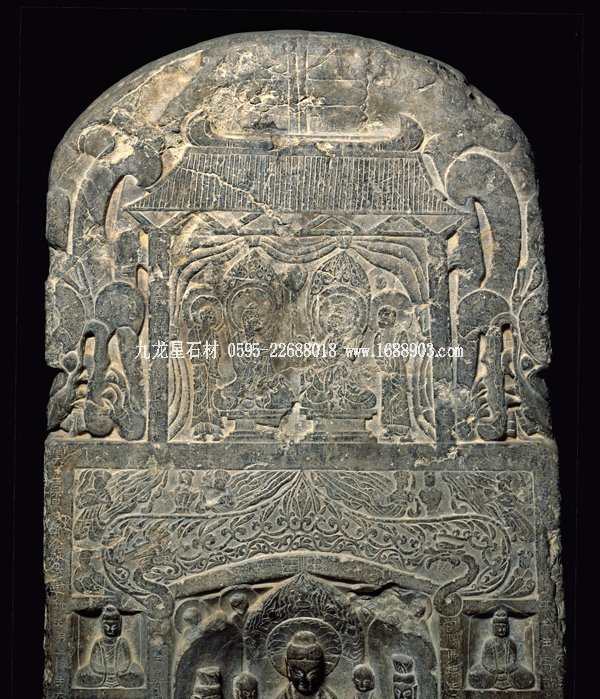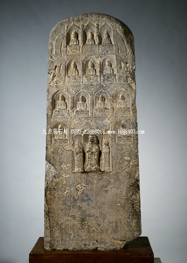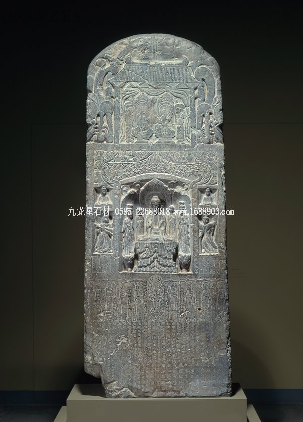 佛造像碑,西魏,公元549年,石灰?guī)r館藏的西魏石碑集兩種造像碑式樣于一體,即雙面數(shù)層佛龕式和千佛碑式。石碑正面是三段式構(gòu)圖。上段用減地陽刻加陰刻的技法刻畫出維摩詰居士和文殊菩薩論法圖。人物刻畫秀骨清風(fēng),頗有魏晉名士風(fēng)流之韻。
