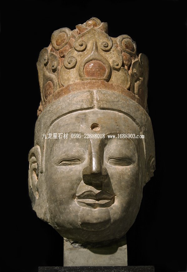 大勢至是西方極樂世界阿彌陀佛的右脅侍菩薩,和左脅侍觀音菩薩及阿彌陀佛,合稱“西方三圣”。大勢至的形象,多是頭戴寶冠,冠中有寶瓶。館藏的北齊大勢至菩薩臉型圓潤,豐唇滿頰。大拱形彎眉之下是細(xì)長的雙眼,用細(xì)線勾出雙層上眼瞼,抿嘴輕笑,又刻意雕出豐實(shí)的下巴。這些獨(dú)特的造型和技法與河北省響堂山石窟的同時代造像完全相同,應(yīng)是原屬于該窟的造像。頭像神態(tài)自信怡然,制作相當(dāng)精美,是北齊石雕像中的佼佼者。