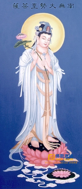 大勢至,音譯摩訶娑太摩缽缽羅缽跢。意譯作“得大勢”、“大精進(jìn)”。略稱勢志菩薩、勢至菩薩。此菩薩以智慧光普照一切,令眾生離三涂,得無上力;又彼行時(shí),十方世界一切地皆震動(dòng),故稱大勢至。與觀世音菩薩同為西方極樂世界阿彌陀佛之脅侍,世稱西方三圣。首楞嚴(yán)經(jīng)卷五念佛圓通章謂,大勢至菩薩于因地時(shí),以念佛心入無生忍,故今攝此娑婆世界之念佛眾生,歸入凈土。又依悲華經(jīng)卷三載,當(dāng)阿彌陀佛入滅后,由觀世音菩薩補(bǔ)其位;觀世音入滅后,則由大勢至補(bǔ)處成佛,掌握化權(quán),號善住珍寶山王如來。