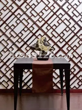 在新中式風(fēng)格的大廳中,石雕作品的外形與背景窗花的菱形相互協(xié)調(diào),取得了很好的諧調(diào)效果。石雕的色彩與整體環(huán)境的深色調(diào)相互統(tǒng)一,臘梅花典雅的黃色又活躍了色彩的意境氛圍。整體空間的直線(xiàn)風(fēng)格與石雕作品的曲線(xiàn)造型相對(duì)比,剛?cè)嵯酀?jì),收放有度,取得了很好的視覺(jué)效果。